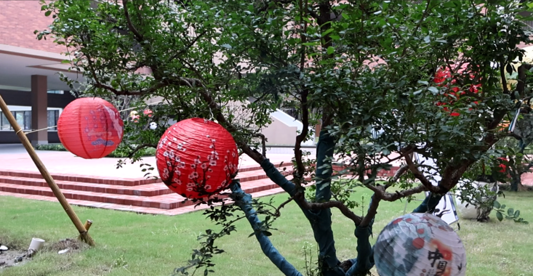 学院里树上挂满了彩色灯笼