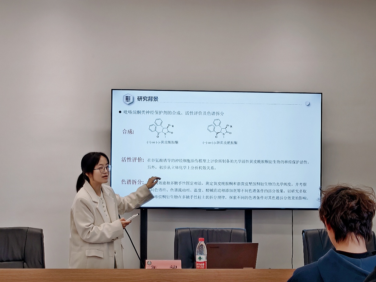 上午9:40,首场报告由王鋆博士主讲,题为《吡咯烷酮类药物及中间体的绿色催化合成研究》。王鋆博士系统介绍了吡咯烷酮类药物在医药工业中的重要性,并围绕绿色催化技术在药物合成中的应用展开深入讲解。她通过详实的实验数据和案例分析,展示了绿色催化在提高反应效率、降低环境污染方面的潜力,为药物绿色合成提供了新思路。