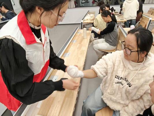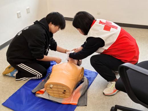 118日,学员们首先通过线上理论考核检验了学习成果,随后进行实操培训与训练。红十字会应急救护师们为同学们演示了心肺复苏术(CPR)的具体操作步骤,讲述了“螺旋包扎、手背八字包扎、四肢离断包扎法头顶帽式包扎法等”各种绷带与三角巾的包扎手法,学员们分组动手练习,大家在反复演练和相互指正中不断精进,晚间教室中依然可见许多主动加练、追求卓越的身影。