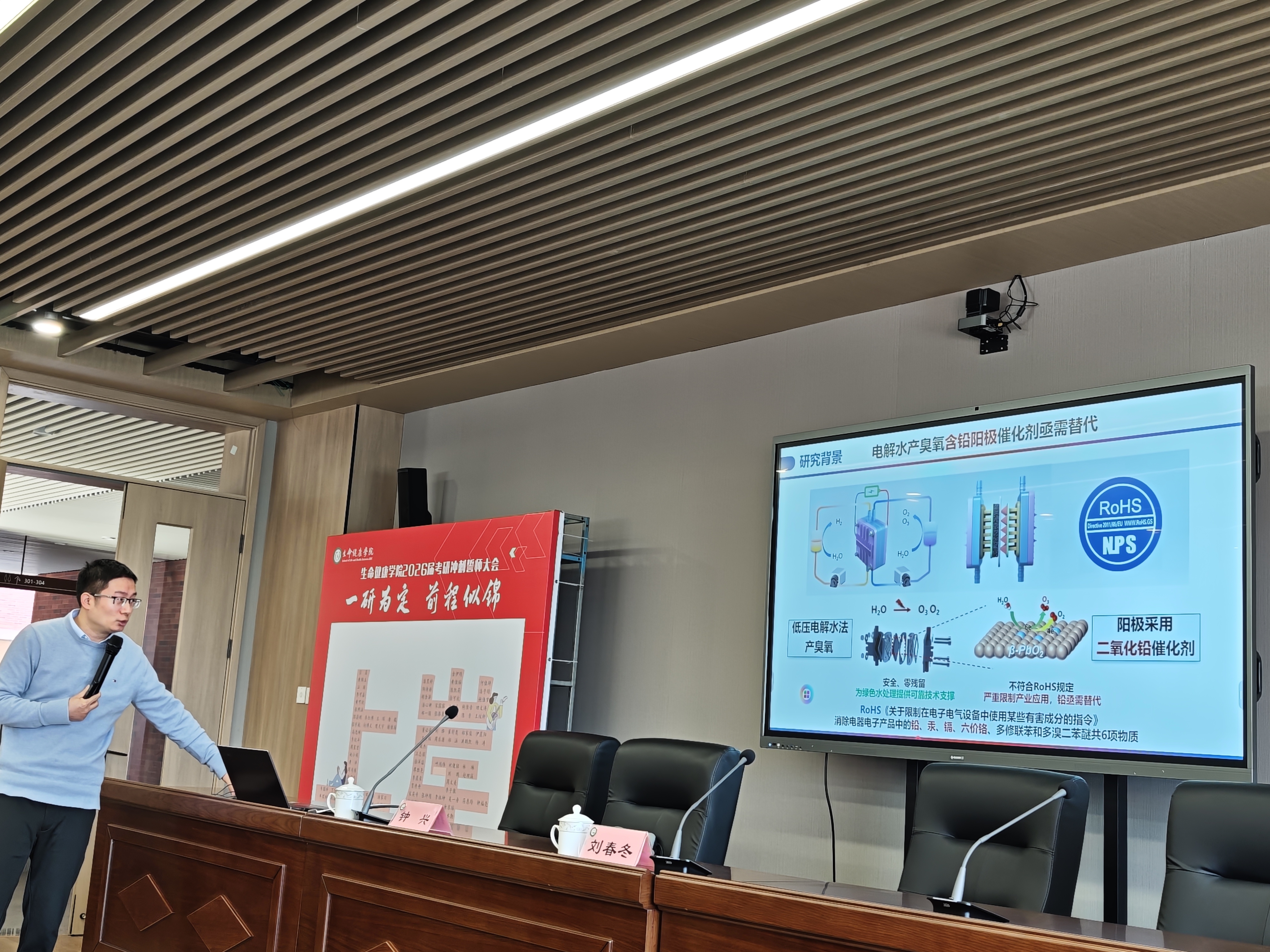 讲座中,钟兴教授系统介绍了低压电解水制备臭氧技术的原理、关键材料与系统设计,重点分享了其团队在高效、低能耗臭氧发生器研发方面的最新进展,并围绕该技术的产业化路径、市场前景与现实挑战进行了深入剖析。钟教授结合自身在科研攻关与技术转化中的实践经验,与在场师生探讨了如何从实际需求中提炼科学问题、推进产学研协同创新的思路与方法。整场讲座内容前沿、逻辑清晰、案例生动,激发了师生对绿色技术开发的浓厚兴趣。