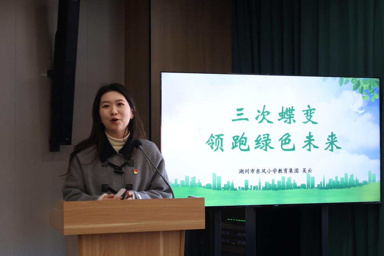 湖州市东风小学教育集团吴云老师以《三次蝶变,领跑绿色未来》为题,分享了湖州在践行"绿水青山就是金山银山"理念过程中的生动实践与显著成效,展现了绿色发展与教育育人的深度融合。