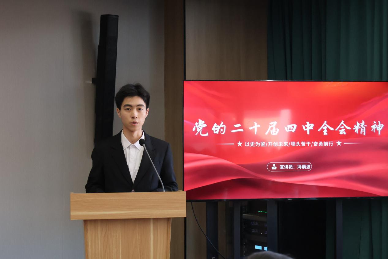 主题党日活动现场,生命健康学院“生声不息”宣讲团成员冯晨波宣讲党的二十届四中全会精神。他从全会的重要意义、核心特征与行动框架入手,清晰阐释了会议在“十四五”规划收官、“十五五”规划启幕的关键节点上,对全面落实党的二十大战略部署、推进中国式现代化的重要地位,并创新采用快问快答互动形式,有效加深了现场师生对全会精神的理解与把握,让理论学习更具趣味性与实效性。