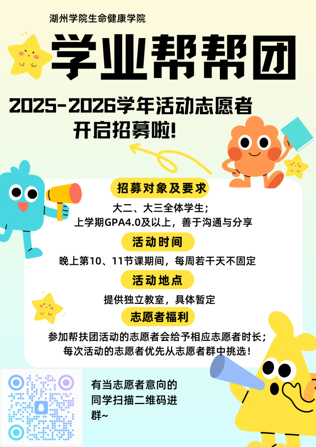 为发挥朋辈互助引领作用,搭建学业、健康、志愿一体化成长平台,湖州学院生命健康学院“润禾”帮扶团现面向全院学子招新。帮扶团下设三大特色板块,经往期实践积累丰硕成果,诚邀志同道合的你携手同行!